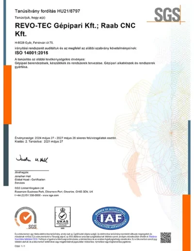 Az ISO 14001:2015 környezetirányítási rendszerünk igazolja, hogy tevékenységeink során kiemelt figyelmet fordítunk a környezeti hatások csökkentésére, és a fenntartható és felelős működésre termékeink gyártása közben.