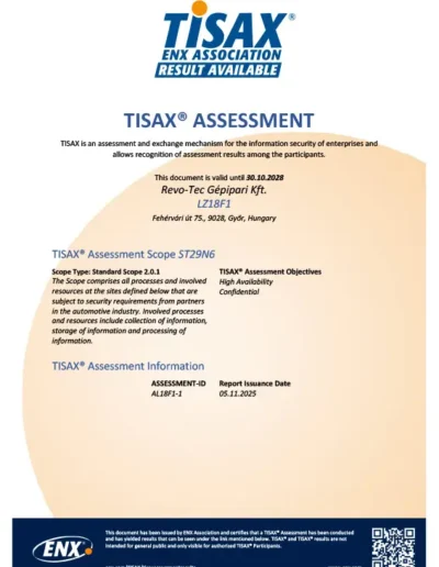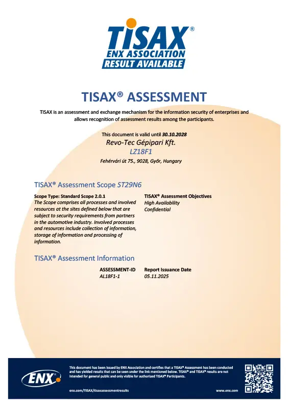 A TISAX® minősítés igazolja, hogy megfelelünk az autóipari partnereink által megkövetelt információbiztonsági követelményeknek, biztosítjuk a bizalmas adatok védelmét és biztonságos tárolását.